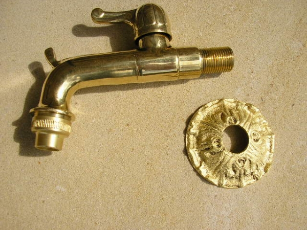Wasserhahn/ Wasserspeier Material: Messing massiv, Wasser Anschluss: 1/2” Aussengewinde, Schlauch Anschluss: 3/4” Aussengewinde Messing massiv, hochglanz poliert, unlackiert, daher läuft der Auslauf nach einiger Zeit dunkel-bronzefarben an und bekommt eine tolle Patina, diese kann jedoch jederzeit wieder entfernt werden. Der Hahn hat einen Adapter mit Gewinde für den Anschluß eines Gartenschlauches und hat einen Eimerhaken, Durchmesser Rosette: 8 cm Länge: 14,5 cm, incl. Versandkosten von 4,90€ innerhalb Deutschlands (außer Inseln)